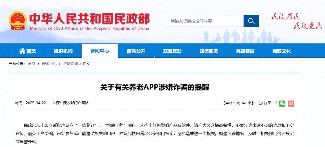 据民政部网站22日消息,民政部从未设立或批准设立“一脉养老”“惠民工程”项目,未推出任何类似产品或软件。