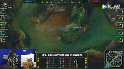在英雄联盟六周年庆典上,超越战队周杰伦德玛西亚打野、解说米勒中单卡尔玛、ADC大嘴卢本伟。酷秀战队吴亦凡策士统领中单、PGone锤石辅助、PDD武器大师上单,最终由大嘴带领超越战队取得比赛胜利。