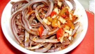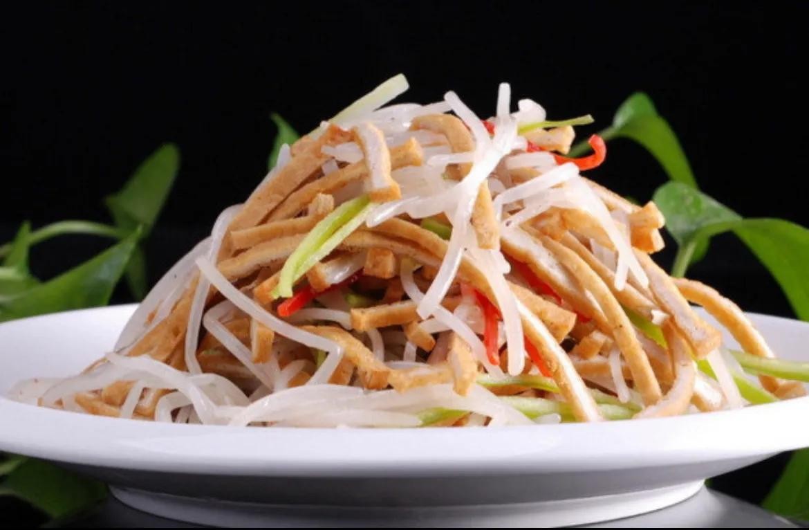粉条豆腐丝:阳泉市所属平定县有道名菜:粉条豆腐丝。这道菜主料是粉条和油豆腐丝,成菜特点是,豆腐丝是炸过的,外脆里嫩,菜看着很温和,没有一点热菜的感觉,但吃起来烫嘴,所以,地道的饭店都会说,我们做得是不冒烟的正宗粉条豆腐丝。