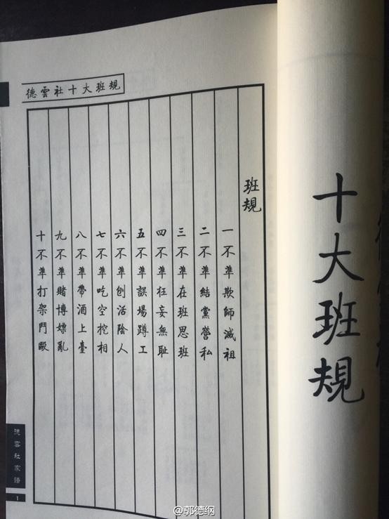 富连成的规矩多,分最要、最忌、责罚、秩序、坐位、责任等款。德云社对富连成的班规简化为十条: