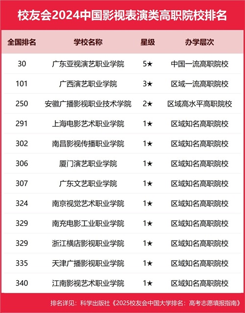 校友会2025中国影视表演类高职院校排名,广西演艺职业学院前二