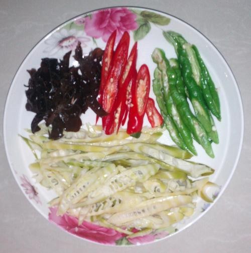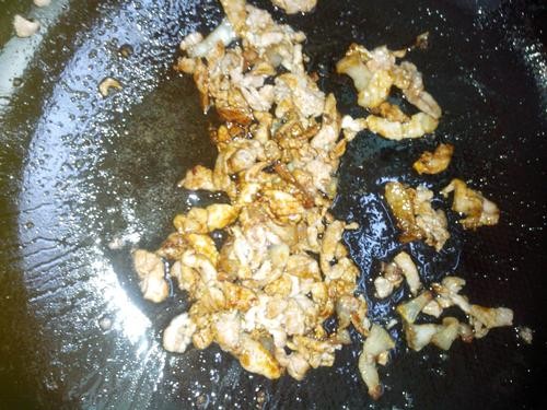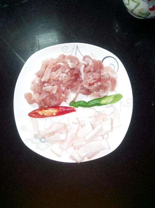 把肉切条状,肥廋分开放,廋肉中加一点盐、糖、老抽、淀粉抓匀。