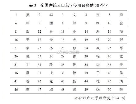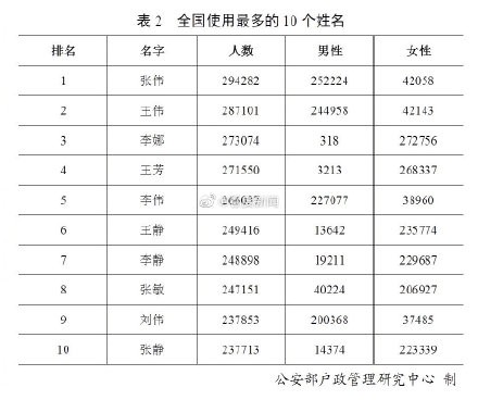【你身边叫张伟的有几个? 全国使用最多的10个姓名】全国户籍人口中,使用频率最高的10个姓名为:张伟、王伟、李娜、王芳、李伟、王静、李静、张敏、刘伟、张静。这些姓名男女皆有使用。名字使用最多的50个字为英、华、文、玉、秀、明、丽、兰、红、金等。小编从小学到大学,班里都会有一个叫做李伟的伙伴,不知道你是不是也遇到过。