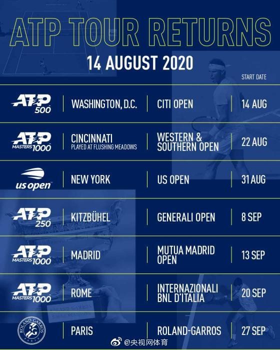 ATP与WTA公布最新赛历 中网暂定10月12日开赛