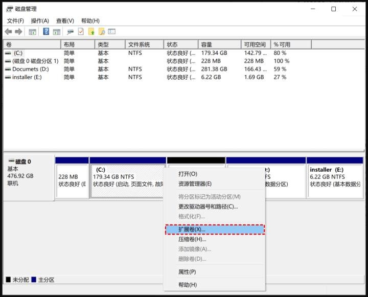 3、在这一步骤中,我们右键选择C盘,然后选择扩展卷点击。