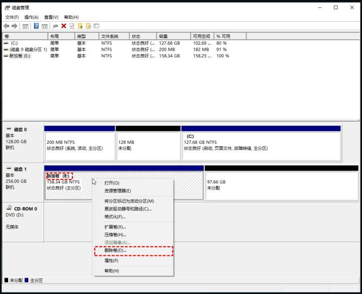 2、在磁盘管理界面,选择你要操作的分区,需要先把分区删除,再把它的空间扩展到C盘上,如图所示。右键需要删除的分区,然后点击删除卷。