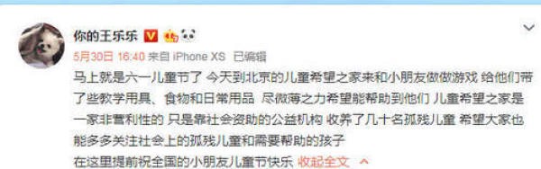 最近他就在微博里分享自己帮助残疾儿童的事情,并且晒出了自己的照片,看的出来他为孩子们准备了很多东西,有食物和衣服,还有一些学习用品。看的出来王乐乐这次很用心在做好事。并且发文还呼吁大家一起帮助这些孩子们,而且为了保护他们,并没有选择跟这些孩子一起拍照。