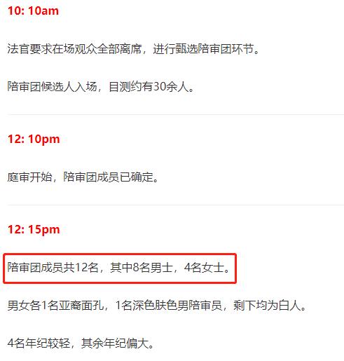庭审开始后,法官要求在场观众全部离席,进行甄选陪审团环节,耗时两小时左右确定12名新陪审团员,其中8名男士,4名女士。法官告知陪审团,这次是案件重审,他们不应该受到之前媒体报道的影响。