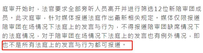 有香港媒体报道,这次庭审针对媒体报道作出了新的规定,媒体仅限报道陪审团在场情况下法庭上的发言和行为,当陪审团缺席时法庭情况不得报道,而且就算陪审团在场,法庭上的一些发言也有例外情况,对媒体要求变严格。