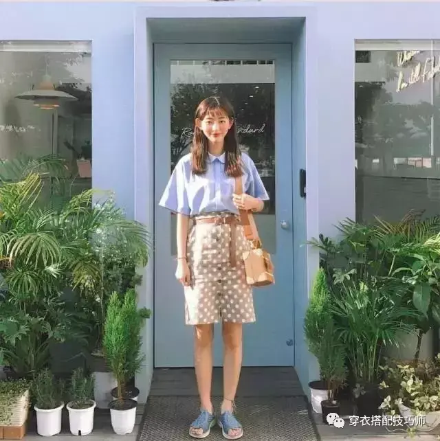 中规中矩的短袖衬衫搭配高腰半身裙,很浓的日系风格穿搭。