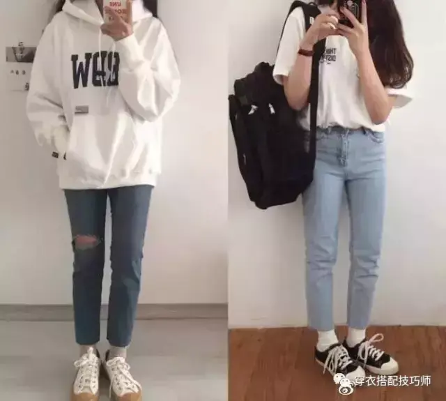 卫衣+牛仔裤搭配绝对不会错,今年流行的小破洞以及高腰复古牛仔裤,都可以选择。