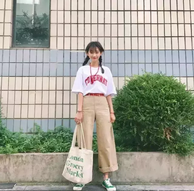 今年流行的阔腿裤,学生党朋友们也可以拿来搭配长袖T恤。