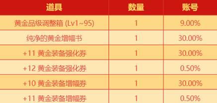 黄金福猪吉梦礼盒:开启后可以从黄金品级调整箱 (Lv1~95)、 纯净的黄金增幅书、 +11 黄金装备强化券、 +12黄金装备强化券、 +10 黄金装备增幅券、 +11 黄金装备增幅券中, 随机获得1个。