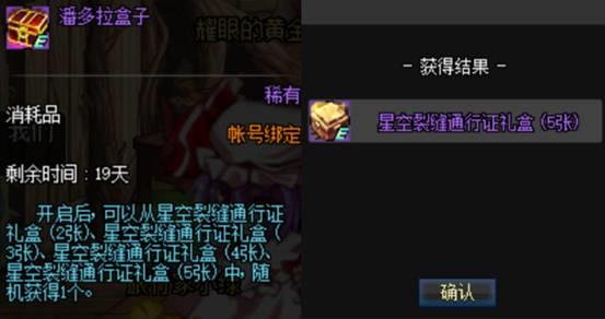 首先要说的就是神秘礼盒天天开这个活动,每天仅需通关1次推荐地下城即可开启潘多拉盒子,开启后可随机获得2~5个番薯,每天只能开1次,通关1次推荐图也就1分钟的事,活动全勤下来共可获得38~95个星空通行证,推荐各位勇士每天都做一下。