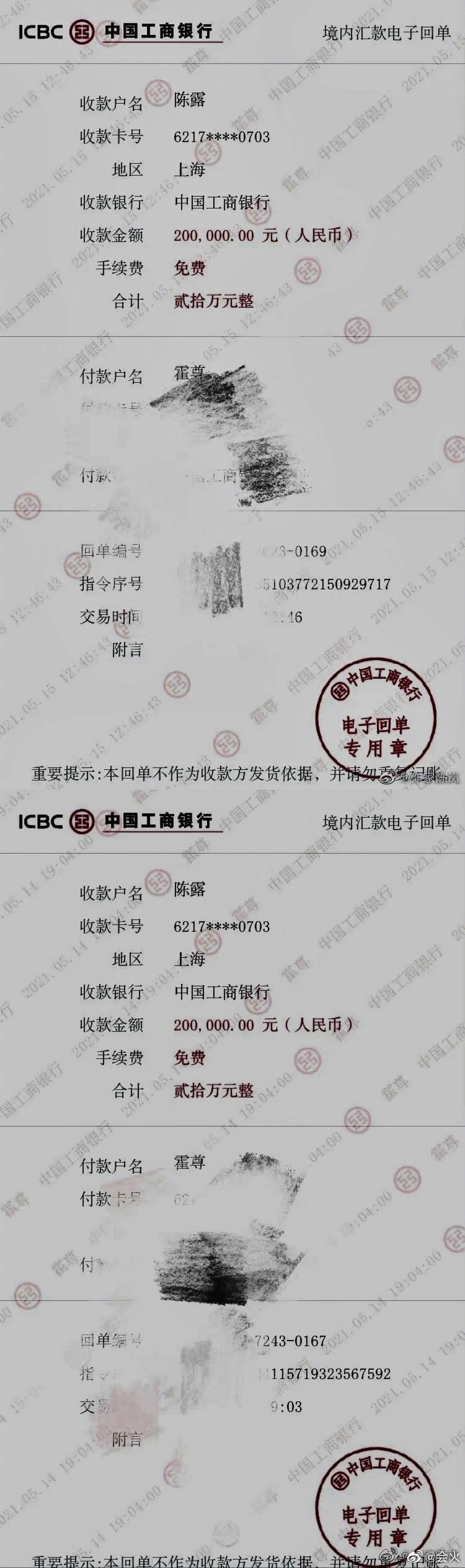 昨天晚上,陈岚又晒出了霍尊给陈岚的转账记录。