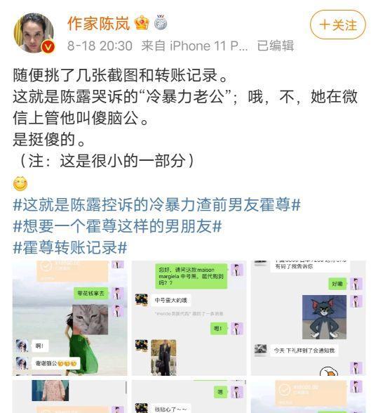 作家陈岚晒霍尊给陈露的转账记录,九年总共不到十万