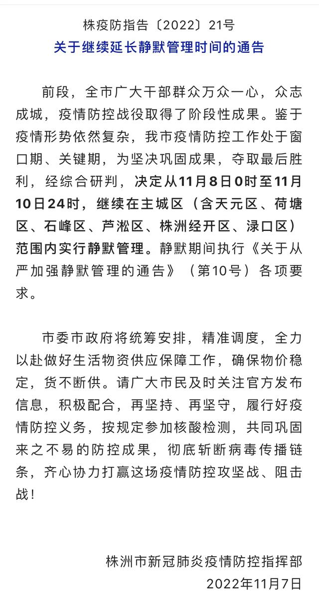 此前,株洲市已于 11 月 3 日发布关于从严加强静默管理的通告。11 月 4 日发布关于延长静默管理时间的通告,决定从 11 月 5 日 0 时至 11 月 7 日 24 时,继续在主城区(含天元区、荷塘区、石峰区、芦淞区、株洲经开区、渌口区)范围内实行静默管理。