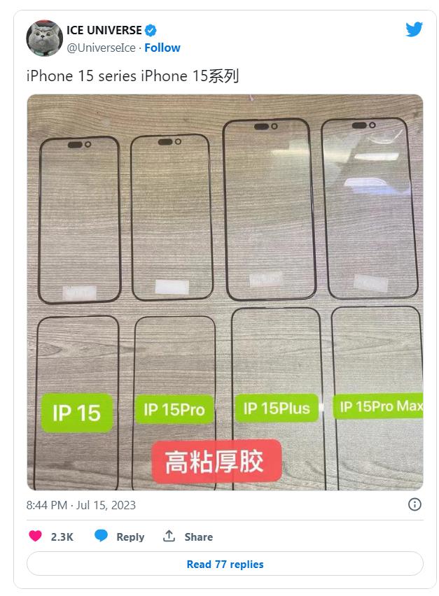 @i 冰宇宙在推文中分享了 8 张屏幕保护膜,其中下方 4 张标注了 iPhone 15、iPhone 15 Pro、iPhone 15 Plus 和 iPhone 15 Pro Max。
