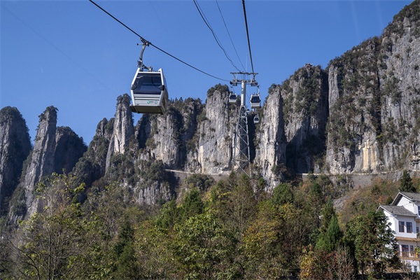 空中客运索道是全封闭式8人轿厢,让游客不用费脚力就能够轻松穿梭在雄伟挺拔的峰林间,感受世界地质奇观的魅力。