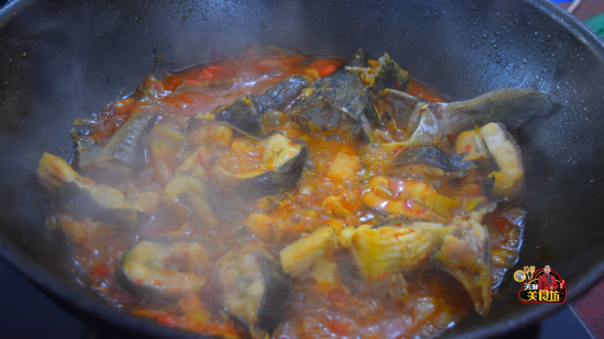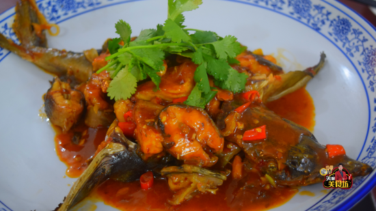 第五步:等汤汁煮开之后,再煮3分钟,煮出香辣味,再放入煎好的鲟鱼块,然后盖上锅盖,中火焖煮15分钟,15分钟后,汤汁所剩不多时,揭开锅盖,淋入少许的水淀粉,大火收汁,等到汤汁浓稠时即可出锅装盘,把汤汁淋到上面,再放上香菜叶子,即可上桌!