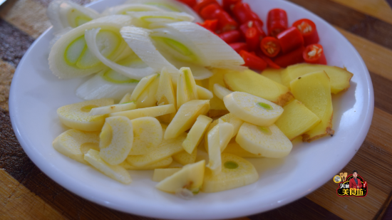 第二步:将小米椒去蒂后,切成小段装盘备用,将大葱切成斜刀片,装盘备用,将生姜切成片,装盘备用,将大蒜切成薄片,装盘备用!