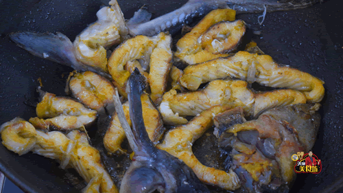 第三步:起锅加油烧热,将腌制好的中华鲟放入锅中,煎至焦黄,然后翻个面,将另一面也煎至焦黄,等鲟鱼煎至两面焦黄之后,盛出备用!