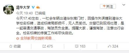 清华大学东南门25日下午被曝遭车撞。晚19:40,清华大学官方微博回应称,事情属实,但是只是一场普通交通事故,一社会车辆撞到清华大学校名标牌,司机因失误负全责。25日下午,网传一车辆撞上清华东南门外“清华大学”校名标牌,致局部被撞毁。晚间清华大学通报称,17点40分左右,一社会车辆出清华东南门时,因操作失误撞到清华大学校名标牌,造成局部损坏,无人员受伤。交警已到现场处理,是一起普通交通事故,驾驶员负全责。校名标牌修复工作将尽快启动。清华大学通报全文今天17:40左右,一社会车辆出清华东南门时,因操作失误撞到清华大学校名标牌,造成标牌局部损坏,无人员受伤。交警已到现场处理,是一起普通交通事故,驾驶员负全责。提醒大家,谨慎驾驶,注意出行安全。校名标牌的修复工作将尽快启动。版权声明:如涉及版权问题,请作者持权属证明与本网联系( 文章来源:安徽网)