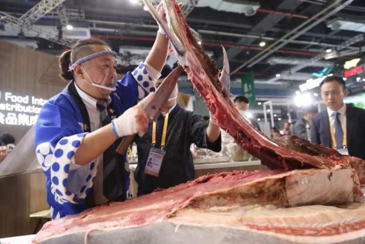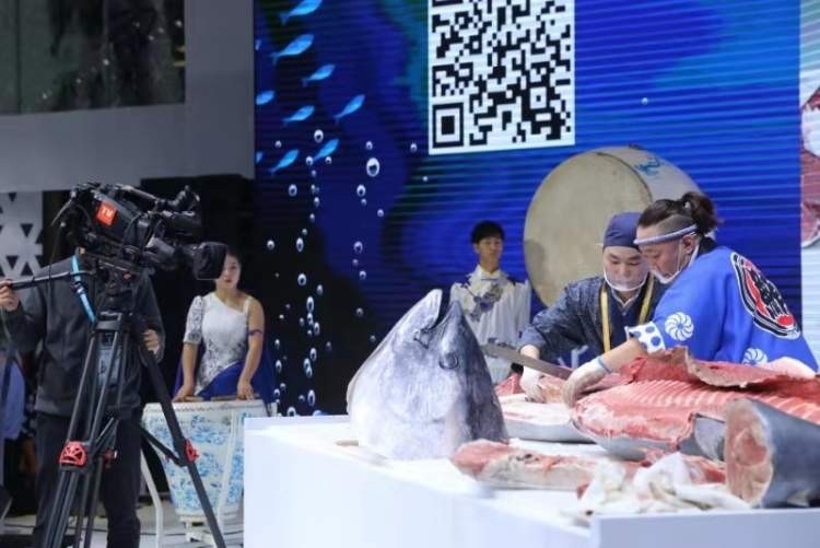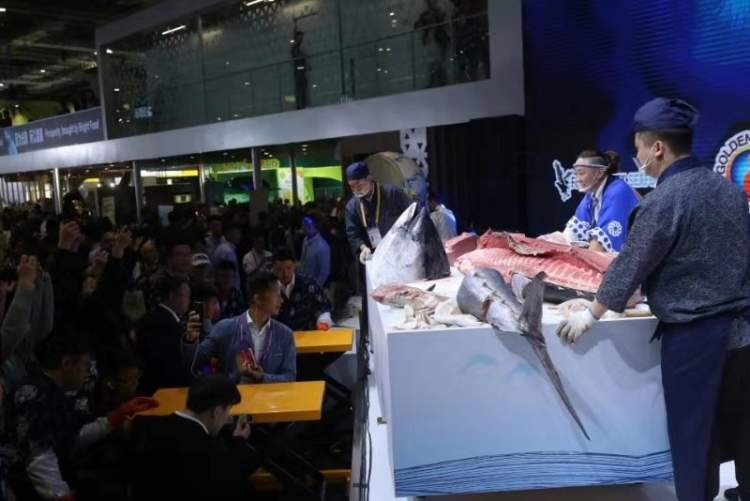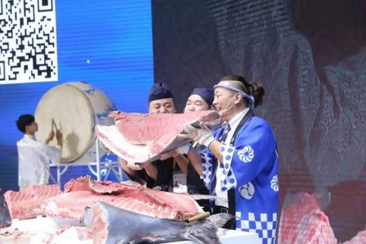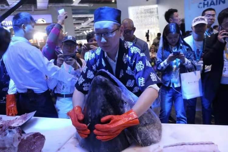 6日中午,来自西班牙的蓝鳍金枪鱼在第二届进博会上举行了开鱼仪式。