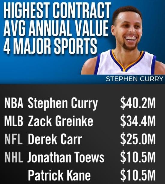 库里和勇士5年2.01亿续约,这让他这份合同中的平均年薪达到了4020万美元。