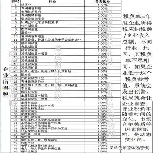 税负率=年度企业所得税应纳税额/企业收入总额;不同行业、地区,其税负率不尽相同,如果企业低于这个税负参考值,系统会发出预警,税局就会让企业自查;行业税负率随着时间的变化、市场竞争关系等因素的影响,是动态变化的。