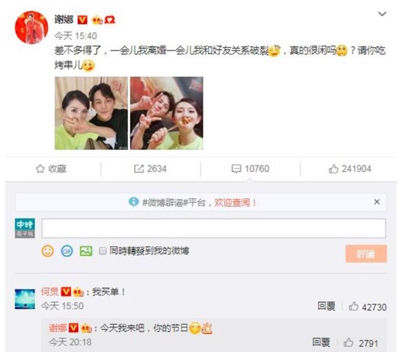 对于网上传闻,谢娜今(10日)就晒出与何炅聚餐的合照,语带无奈写下:「差不多得了,一会儿我离婚一会儿我和好友关系破裂,真的很闲吗? 请你吃烤串儿。 」而何炅也在底下幽默回复:「我买单! 」谢娜接着又搞笑回:「今天我来吧」,一来一往的逗趣互动,直接打破友情决裂谣言。