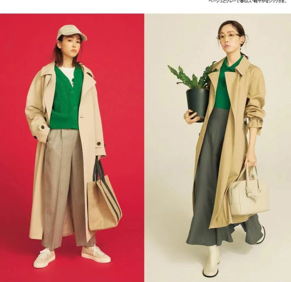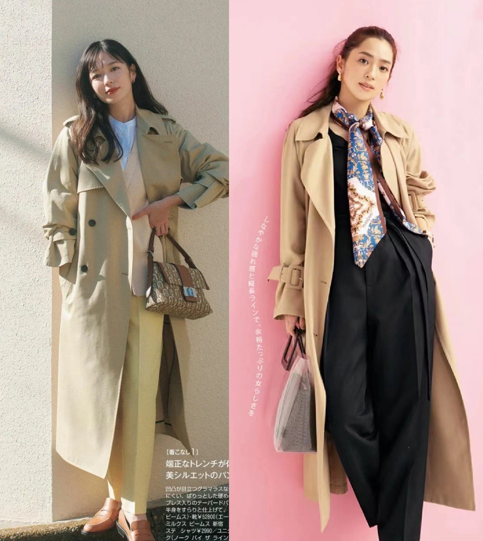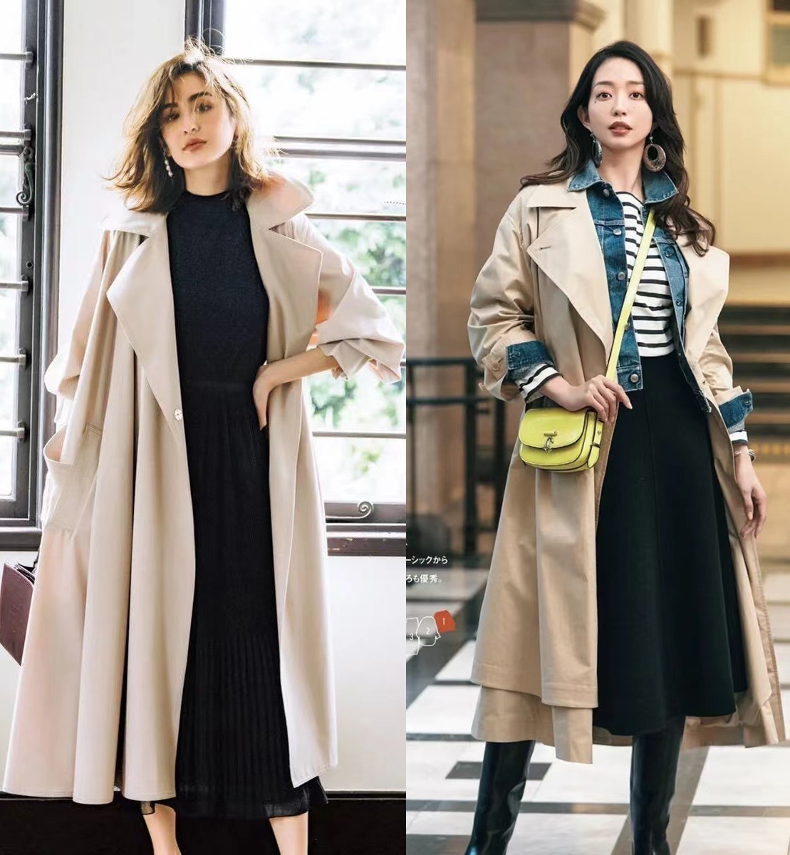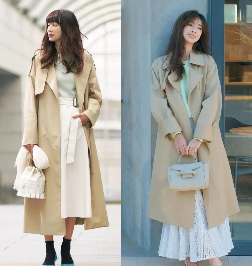 搭配的同一款风衣,其中与半身裙搭配在一起的look,就显得比较轻盈温柔,而且从图中也能看出,半身裙对于下半身的修饰能力要更突出,如果是比例不佳的女性,就可以多多穿裙子,以此模糊腰线的具体位置。