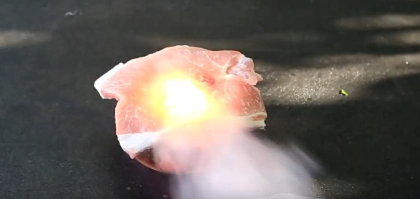 将一点点白磷放在肉上时,白磷瞬间将肉烧出了一个洞,如果没有外界的阻止,它还会一直燃烧下去,直到所有的白磷都燃烧殆尽。