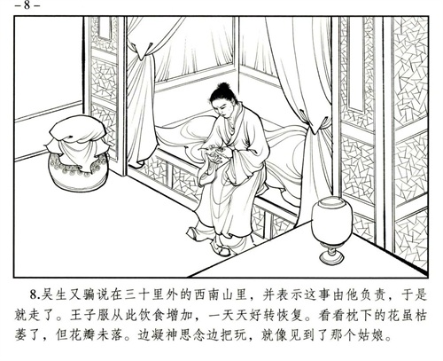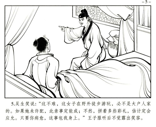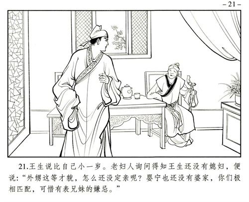 《聊斋志异》中的《婴宁》讲述了一个关于狐仙和鬼魂所生孤女婴宁的故事。婴宁为了将母亲的骨骸与所爱之人并骨,用计进入王家。王子服是一位一心科举的小书生,因为在一次郊游中遇见了婴宁,对她一见钟情,饱受相思之苦,最终迎娶婴宁过门。
