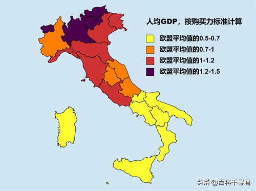 意大利整体上北富南穷,这是由自然和历史原因导致的。意大利人均PPS最低的是卡拉布里亚大区,为欧盟平均值的55%。最高的是博尔扎诺自治省,是欧盟平均值的1.5倍。