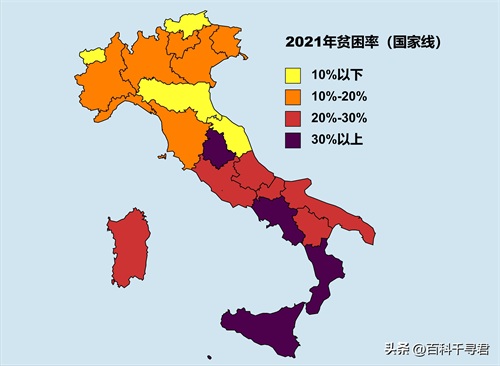 这个贫困率是指国家线,同样也是北富南穷的局面。南部的坎帕尼亚、卡拉布里亚和西西里的贫困率都超过30%。
