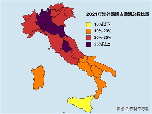 意大利非常开放,涉外婚姻占比较高,占到了婚姻总数的19.4%。北部高于南部,伦巴第、艾米利亚-罗马涅和翁布里亚都在25%以上。最低的是西西里岛,也有9.1%。