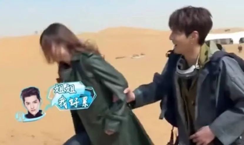 比如两人在执行任务的时候,在沙漠中穿行,吴亦凡一个身强体壮的男生却一直跟在赵丽颖的后面,爬坡的时候,赵丽颖在前面走,吴亦凡直接抓住了她的手臂,让她拉着他走,赵丽颖只能无语的翻了个白眼。