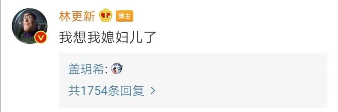林更新在自己的评论区留言“我想我媳妇儿了”,盖玥希还赶来回复。互动甜蜜有爱。