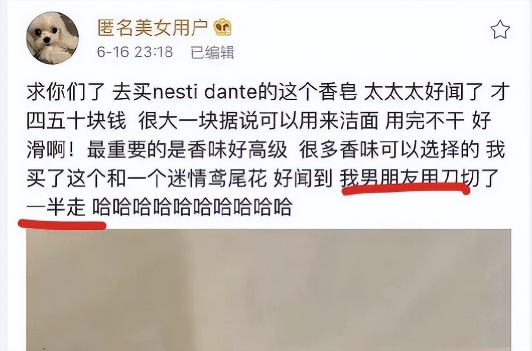 一位女网友分享了很好用的香皂,味道好闻高级,呼吁大家去买,最后提及男朋友切走了一半,而该男朋友被扒是谷嘉诚,“香皂梗”被网友耻笑至今。