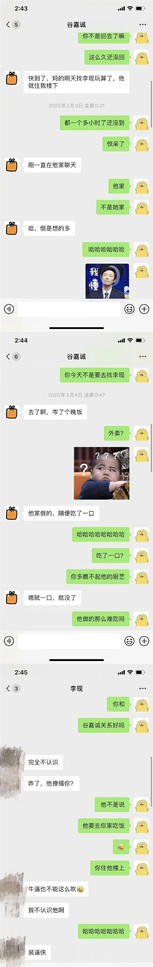 2020年的时候,谷嘉诚曾被曝光乱聊,女孩子直接晒出了两人的聊天记录。聊天记录中,谷嘉诚说李现就住自己家楼下,在李现家吃了晚饭,还说明天还去找他玩。