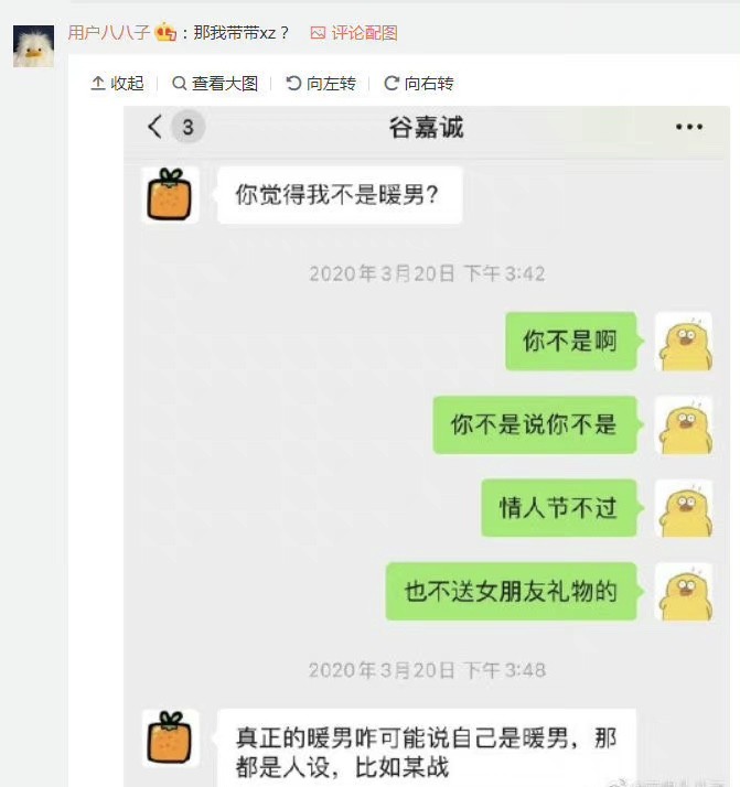 谷嘉诚则自信回复“真正的暖男咋可能说自己是暖男,都是人设,比如肖战。”