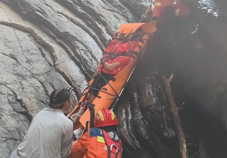 7月21日12时许,湖北襄阳,一名18岁小伙失足掉进30多米深的溶洞暗河内。经现场检查,男子腰部摔伤,消防员将其固定在担架上转移。