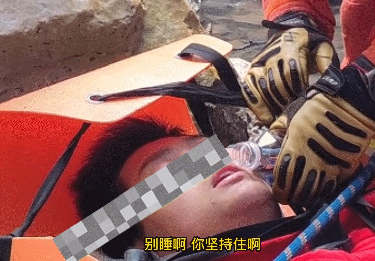 6名消防员采用拖拽等方式转运。中途,伤者曾出现意识模糊,消防员边给伤者喂水,边连连安慰鼓劲儿:“别睡啊,坚持住!”