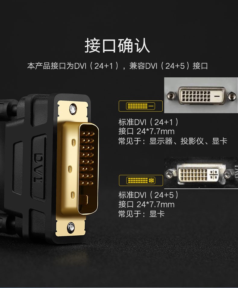 说明:目前的DVI接口分为两种:一个是DVI-D接口,只能接收数字信号,接口上只有3排8列共24个针脚,其中右上角的一个针脚为空。不兼容模拟信号。另外一种则是DVI-I接口,可同时兼容模拟和数字信号。兼容模拟幸好并不意味着模拟信号的接口D-Sub接口可以连接在DVI-I接口上,而是必须通过一个转换接头才能使用,一般采用这种接口的显卡都会带有相关的转换接头。