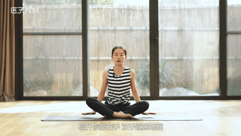 3、下次吸气慢慢将身体回正,松开右手,双手返回地面;