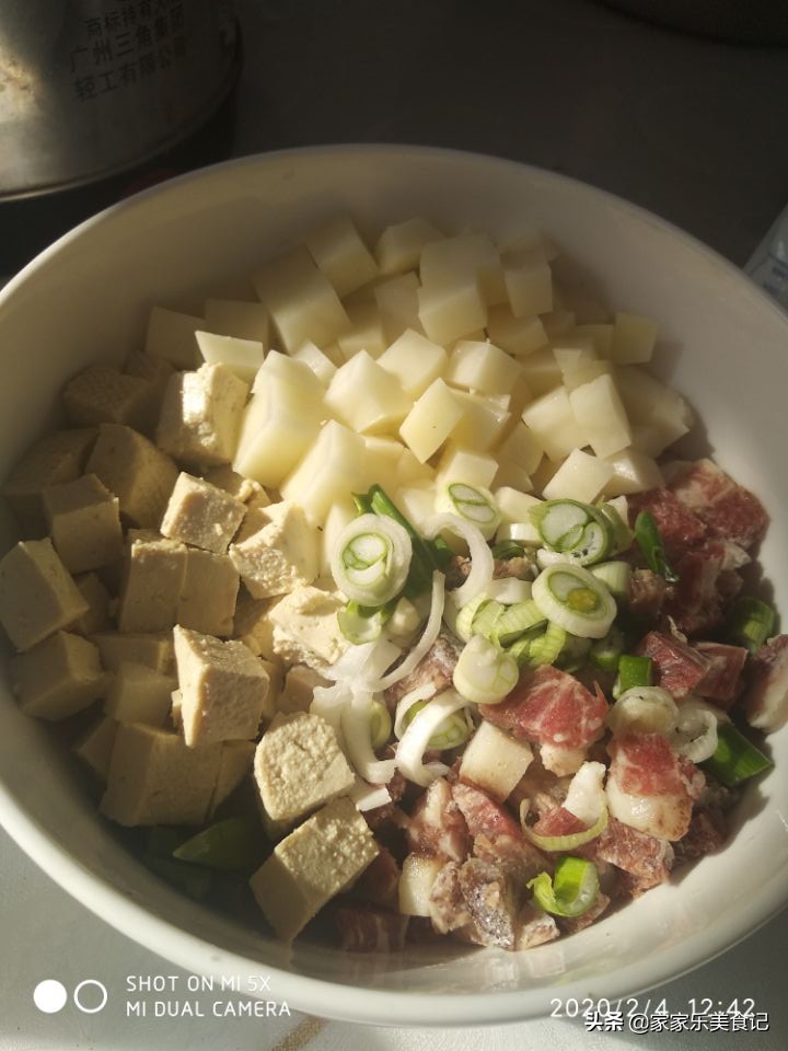 4.半个土豆切成丁,适量的豆腐丁,五花肉丁,一颗葱全部切好以后装在碗里备用。