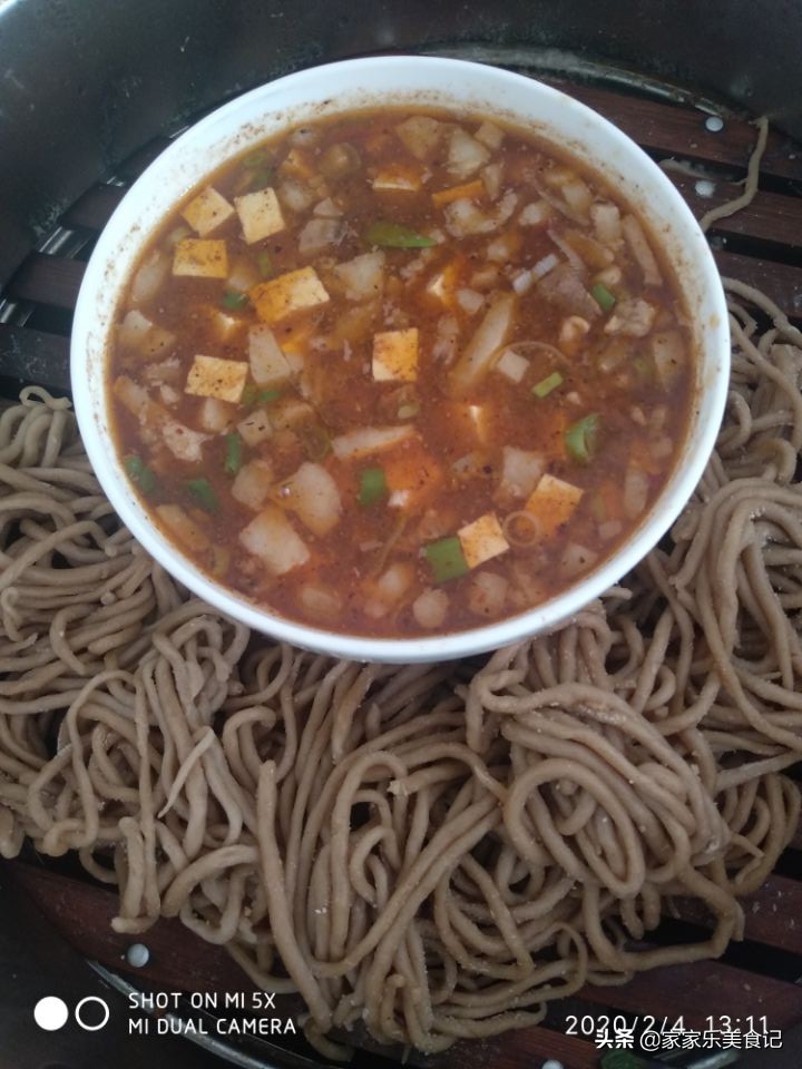 6.莜面条和配菜碗一起放在蒸笼上,盖上锅盖大火蒸上15分钟就可以了,蒸好的莜面表面发亮,这是老人告诉我的判断莜面是否蒸熟的小妙招。