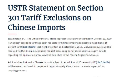 当地时间10月18日,美国贸易代表办公室(USTR)发布最新公告声明,决定在10月31日正式对中国3000亿美元征税清单(2019年9月1日起加征15%关税的A部分清单)产品启动排除程序。