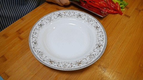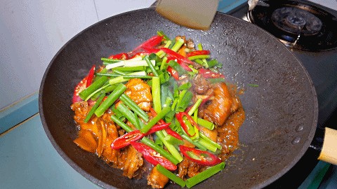 10.最后下入小葱段和红线椒,翻炒片刻,炒出葱香味后即可出锅。